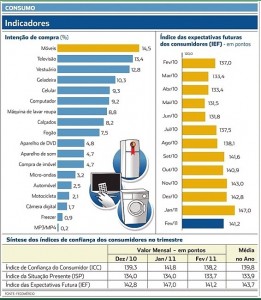 Em fevereiro, o Índice de Confiança do Consumidor (ICC) apresenta valor de 138,2 pontos, abaixo do verificado em janeiro (141,8 pontos) e levemente superior quando comparado a fevereiro de 2010 (136,1). Os dados integram a Pesquisa “Confiança e intenção de compras do Consumidor de Fortaleza”, divulgada ontem, pelo Instituto de Pesquisa e Desenvolvimento do Comércio (IPDC), órgão vinculado à Federação do Comércio do Estado do Ceará (Fecomércio/CE). O estudo foi elaborado em parceria com o Banco do Nordeste (BNB).